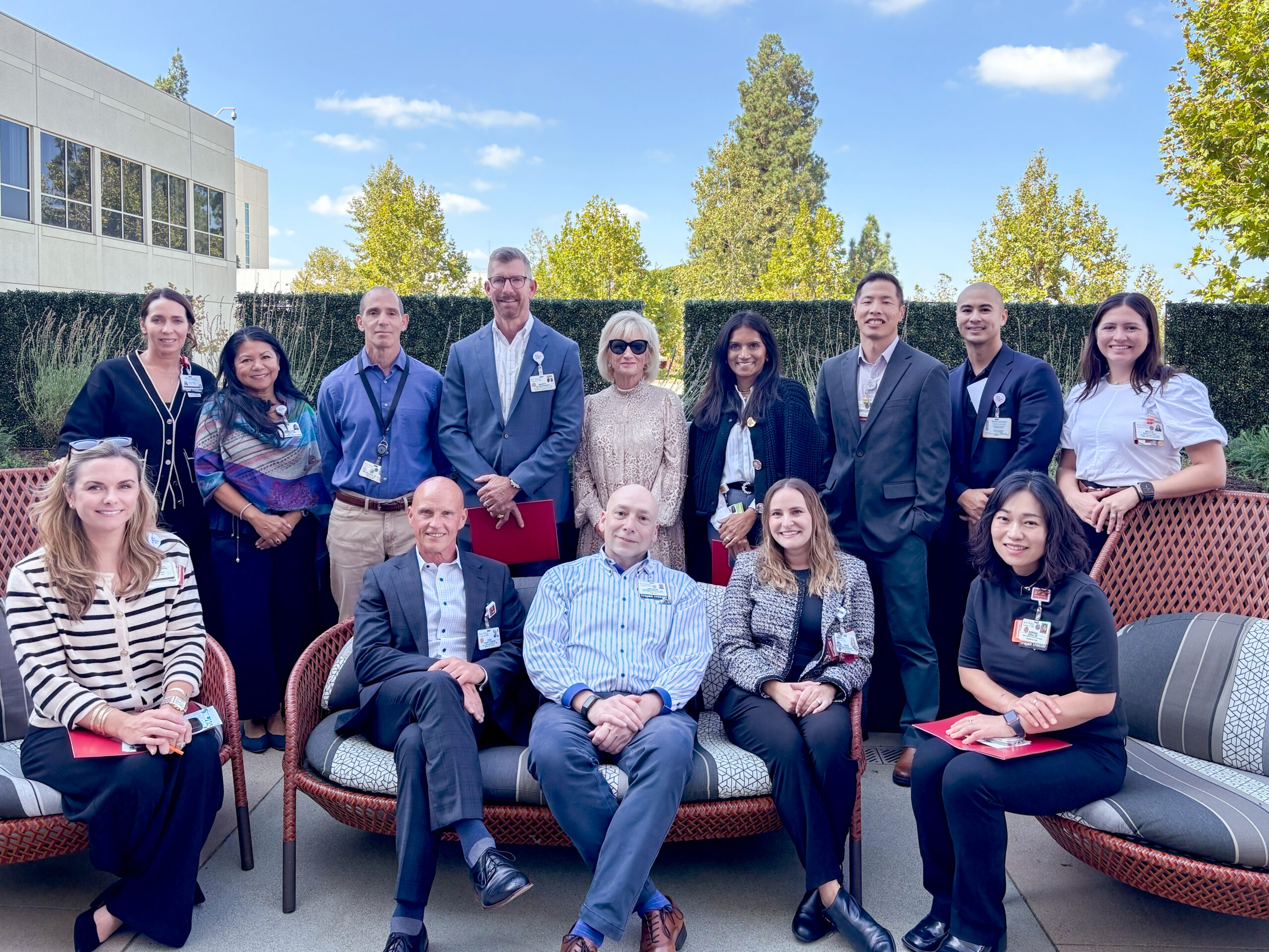Keck Medicine of USC staff and leaders tour the new Tranquility Terrace. Front row, left to right: Anne McGilvray, Rod Hanners, Andy Stringfellow, Dara Marino, and Sophia Lee. Second row, left to right: Brooke Glazer, Geraldine Pahed, Steven Siegel, Marty Sargeant, Tammy Capretta, Smitha Ravipudi, Jonathan Wong, Kristian Dijamco and Becca Cahal.